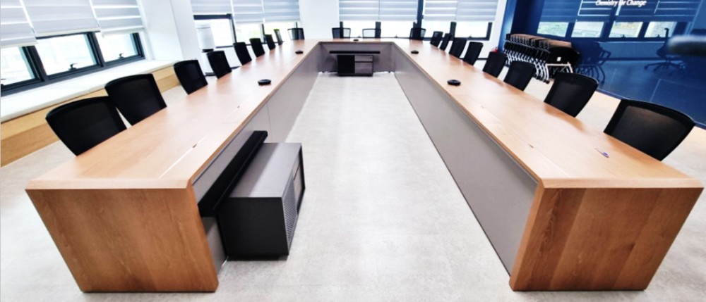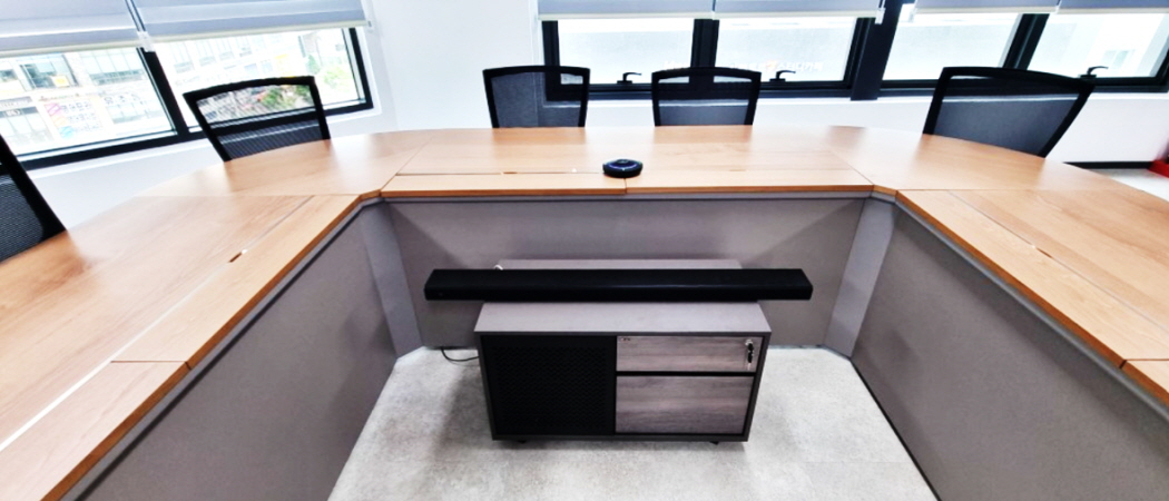 ○ RM-TT(탁상 마이크) 2ea, RM-CR(DSP) 1ea, VXL1B-16P(라인어레이스피커) 2ea 설치한 모습입니다.