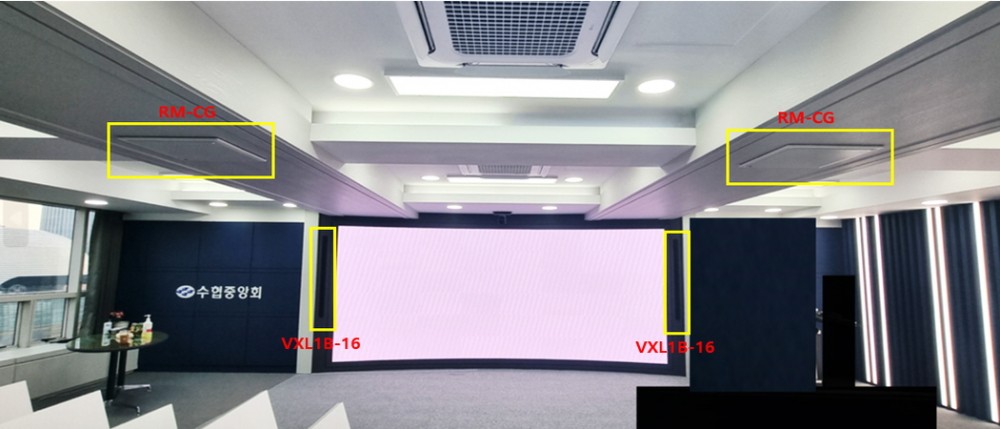 ○ RM-CG(천장 마이크) 2ea, RM-CR(DSP) 1ea, PX3(파워앰프) 1ea, VXL1B-24(라인어레이스피커) 2ea를 설치하였습니다.