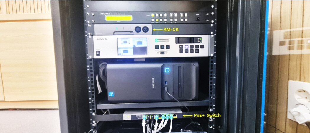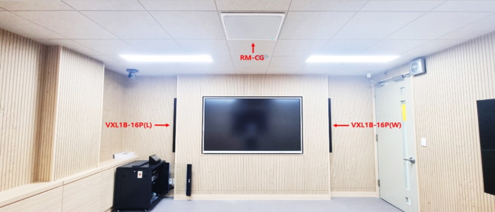 ○ RM-CG(천장 마이크) 1ea, RM-CR(DSP) 1ea, VXL1B-16P(라인어레이스피커) 2ea, 무선 핸드 마이크 1를 설치하였습니다.