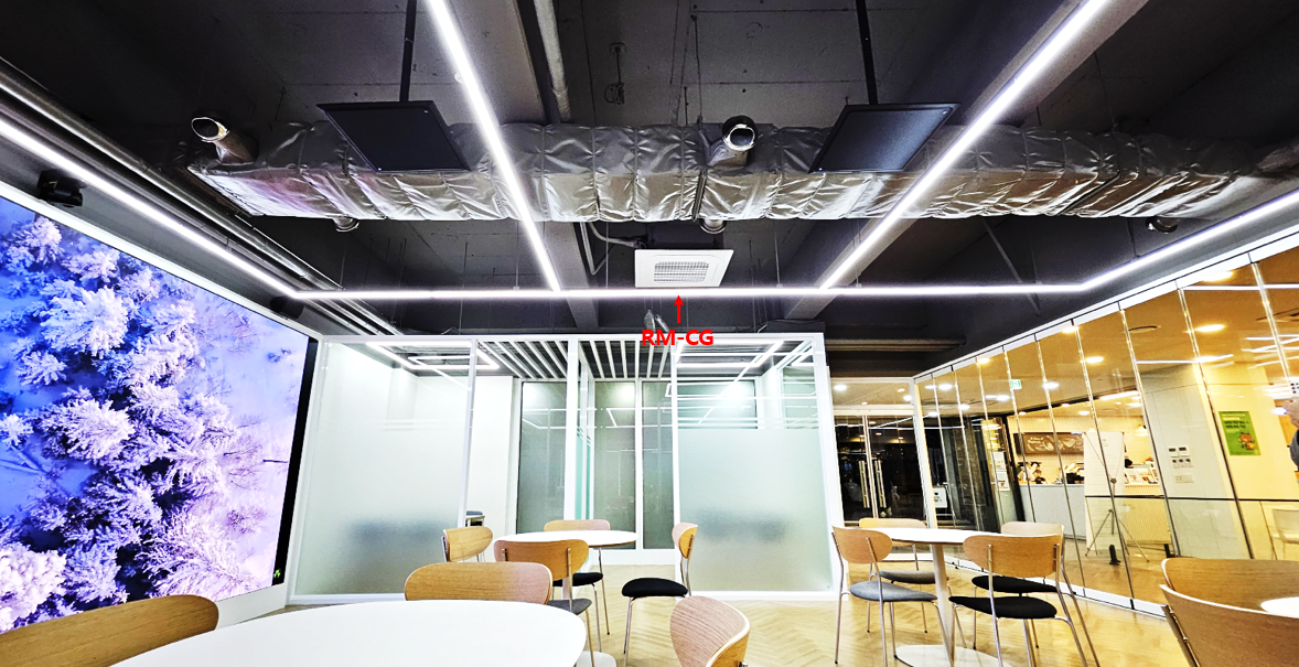 ○ 천장 인테리어 마감을 하지 않고 모든 설비 장비 전체가 노출된 오픈 천장이라 매립 대신 VESA Mount 방식으로 설치하였습니다.
