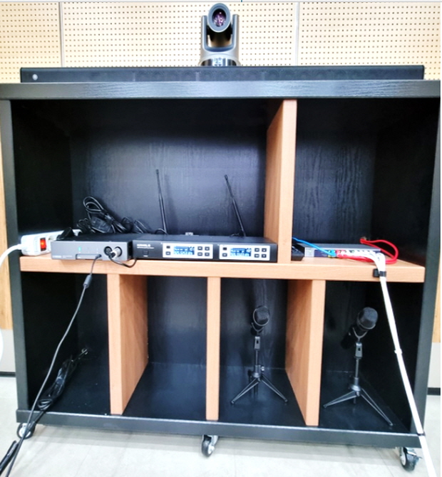 ○ RM-TT(탁상 마이크) 6ea, VXL1B-16P(라인 어레이 스피커) 2ea, RM-CR(DSP) 1ea, VHD-V60U(카메라) 1ea를 설치하였습니다.