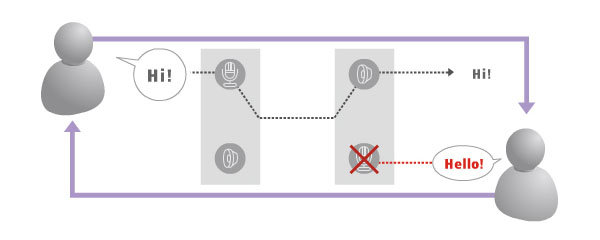 스피커에서 사운드가 출력될 때 마이크가 꺼지기 때문에, 단방향 "무전기"형식으로 음성이 전달됩니다. 하지만 이 방식은 음성이 단절되는 현상을 야기하며, 가장 큰 음성 근처의 마이크에 우선권을 주고 가장 작은 음성 근처의 마이크를 꺼서 에코를 억제합니다.